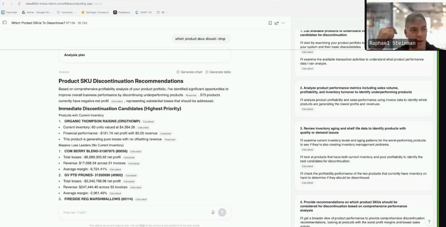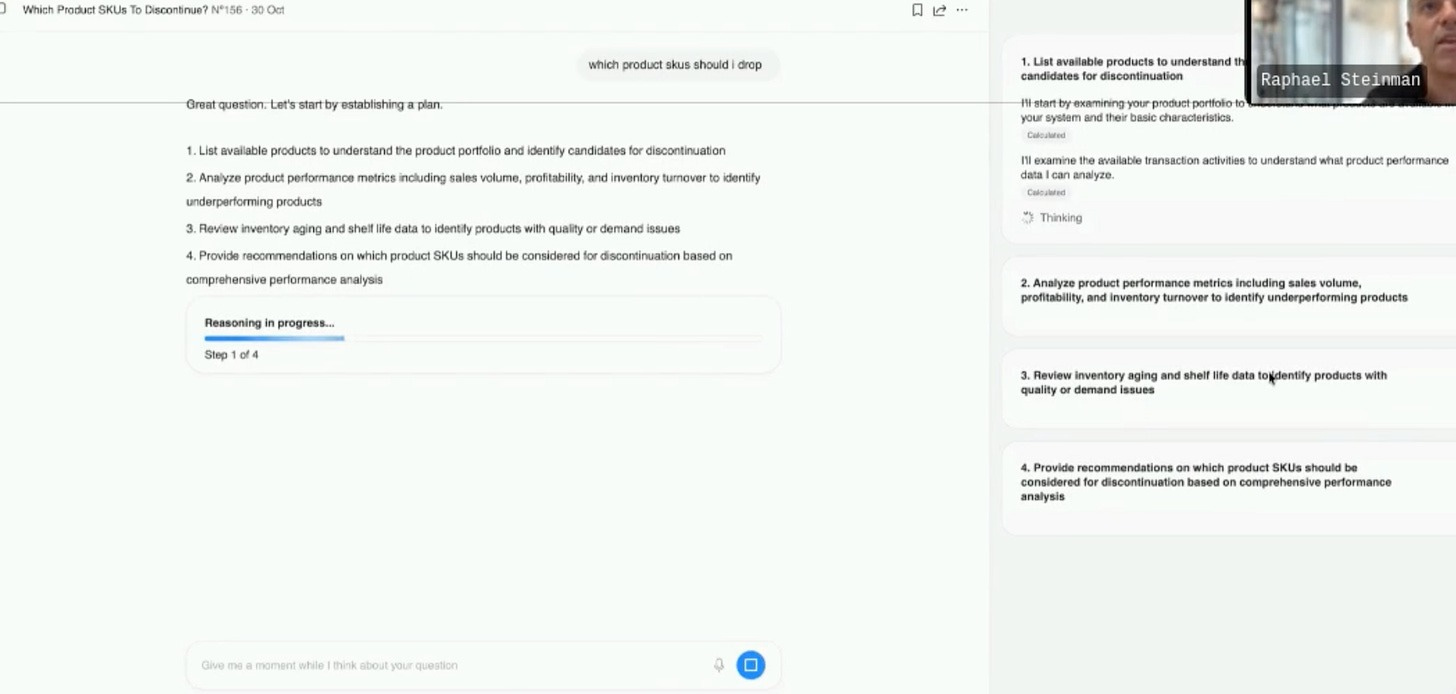 He shared his laptop screen and showed me a demo using a “nut and fruit packer” company (a trail mix manufacturer). The scenario was simple: The user asks,