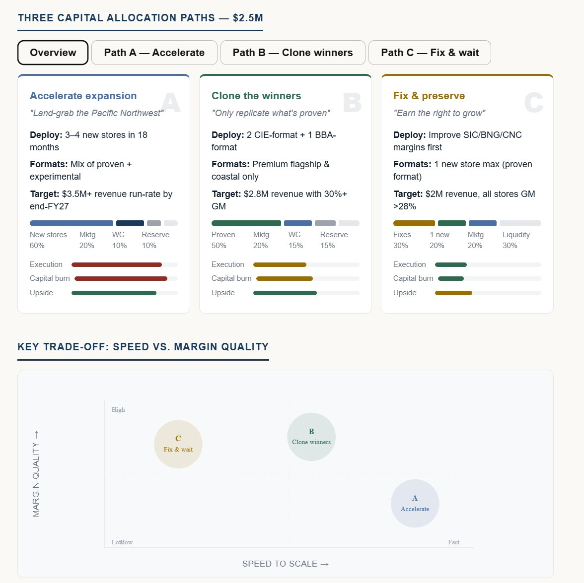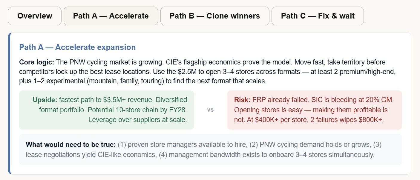 Path A. Aggressive expansion. Open new stores fast; accept the risk.
