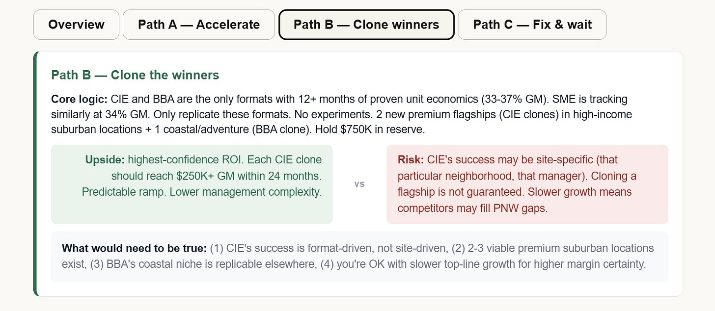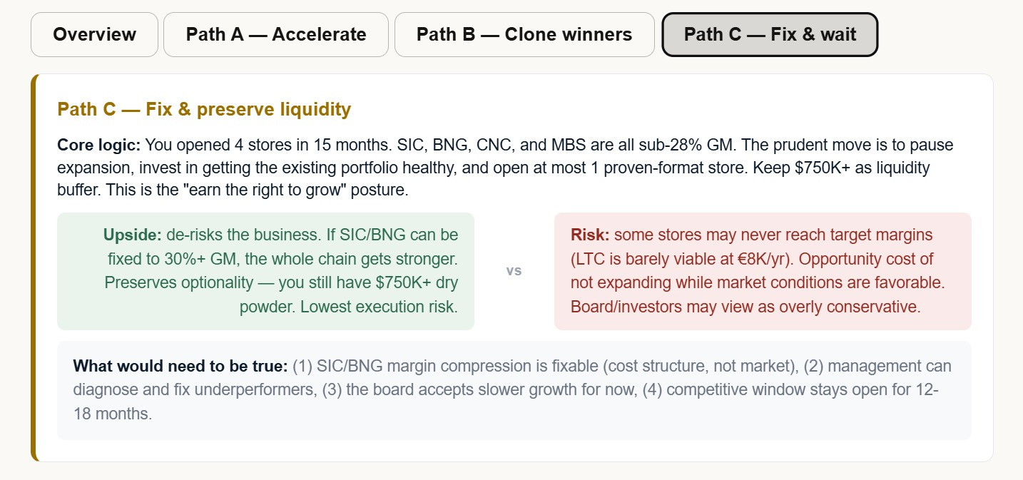 3. Improve weaker stores and preserve liquidity until the newer locations mature.I told Claude not to build a dashboard. Stay in workshop mode. Think with me first.