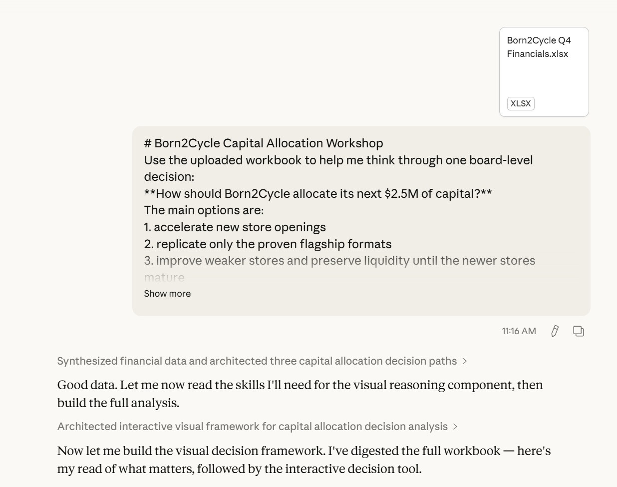 I uploaded a P&L. Claude didn’t hand me a dashboard. It read the business, visualized the portfolio, built three capital allocation scenarios, asked me five questions, and then produced a board-ready deck.