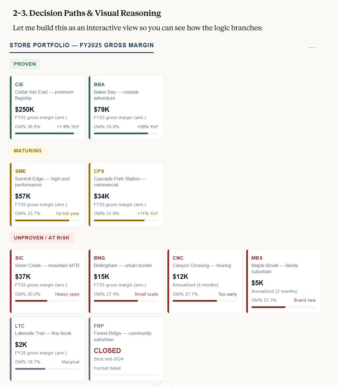 Claude builds an interactive map of the entire store portfolio and categorizes each location by risk profile. Proven performers, scaling stores, early-stage locations, and underperformers. All visible in one view.