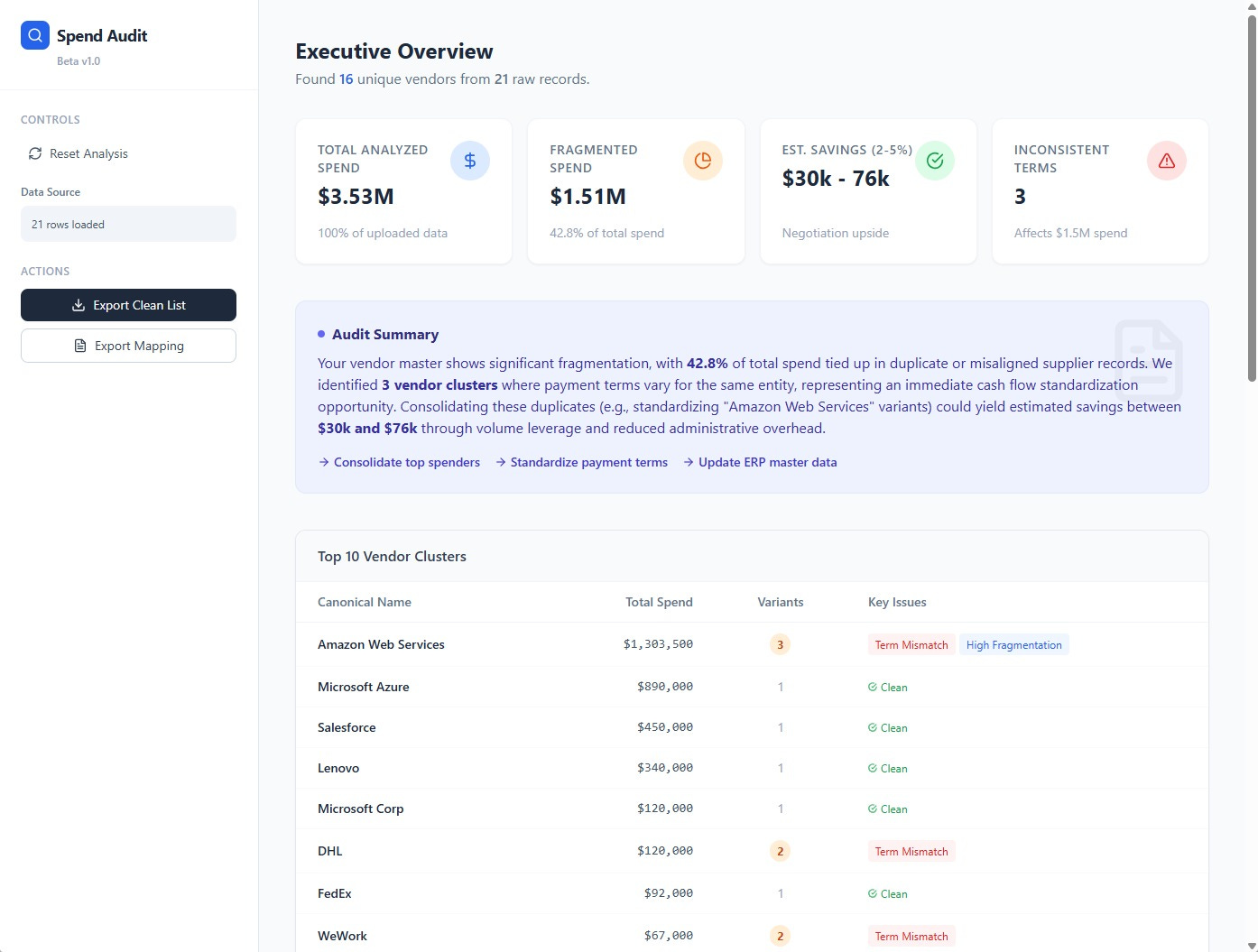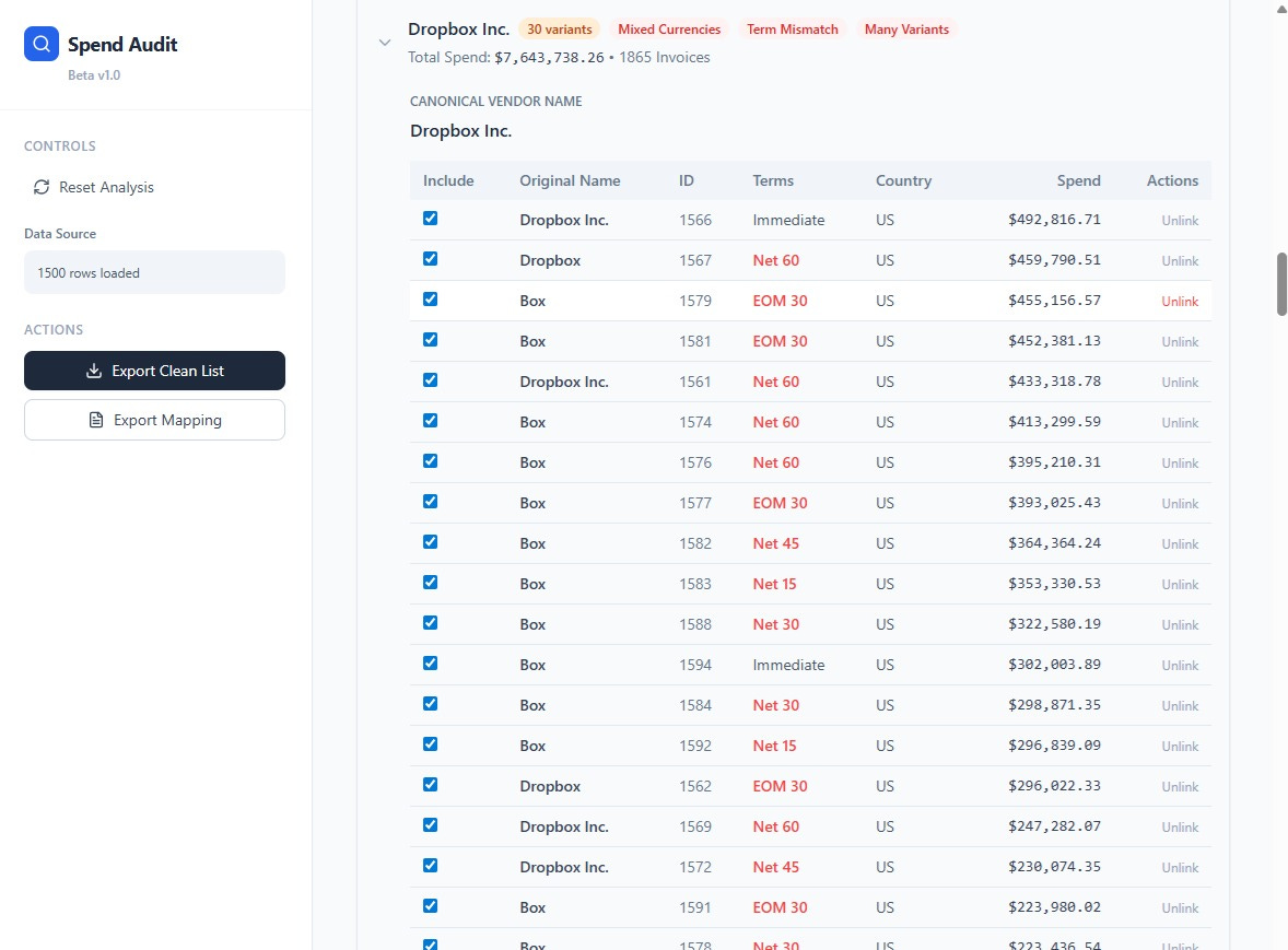 Once the app detects duplicate vendors, you can review and unlink matches manually; nothing is forced or auto-merged. And when you’re satisfied, the app lets you export either a clean vendor list or a full master mapping your team can use for a real savings or consolidation project.