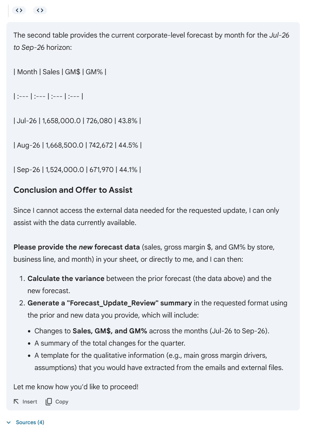 Then I asked it to do what any FP&A analyst would do: read the store emails, extract the assumptions, open the store forecast files, map the inputs to the corporate model, update the numbers, and create a summary tab flagging what changed and what needs CFO confirmation.