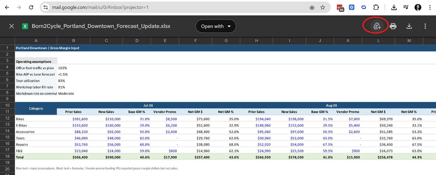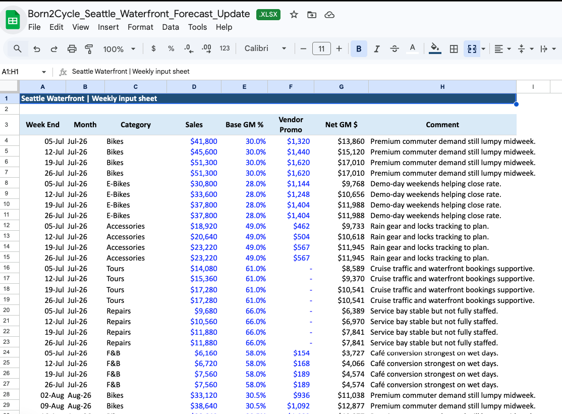Subject: July reforecast update - Portland Downtown Hi FP&A team, We are sending an updated summer gross margin forecast for Portland Downtown. Demand has held up better than we expected in commuter bikes and workshop traffic, helped by downtown office attendance ticking up on Tuesdays through Thursdays. What changed vs last view: • Bikes are slightly lower on units than the June plan, but vendor support from Trek is preserving margin. • Accessories and workshop sales are outperforming because attach rates on commuter bundles remain healthy. • Tours are still solid for July/August, though we are keeping September conservative until we see how late-season tourism books. Tone from the floor is cautiously optimistic. Team energy is good, but we are still matching a few local bike-shop promotions on selected bikes and e-bikes, so mix matters more than volume right now. Please use the attached sheet as our latest view. Thanks, Maya