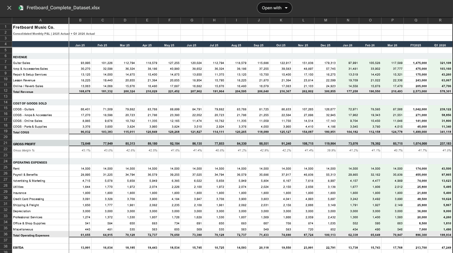 Glenn is using Fretboard Music Co., a synthetic three-location guitar retailer with a full dataset: monthly P&L, trial balances, and planning assumptions. Realistic enough to hold up to a finance audience.