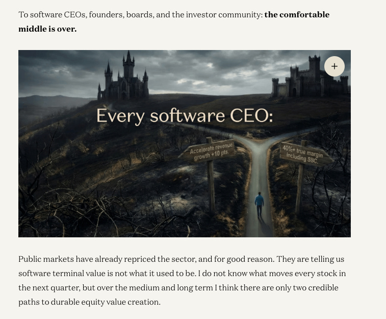 a16z published an essay this month called “There Are Only Two Paths Left for Software.” The argument: every software vendor must either grow revenue 10%+ faster through AI-native products or rebuild to 40%+ true operating margins. Everything in between is “no-man’s land.”