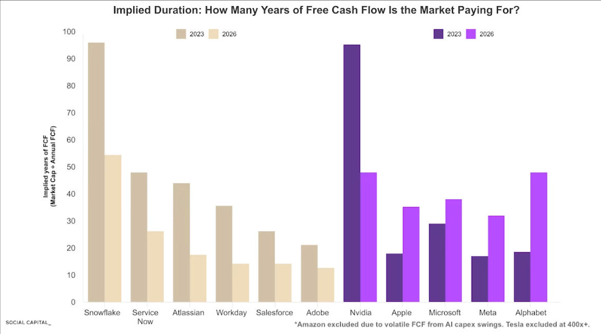 If AI lowers the cost of disruption so dramatically that no company can credibly project free cash flow beyond five years, equities would need to get repriced not as discounted streams of future cash flows, but as a multiple of what they generate right now.