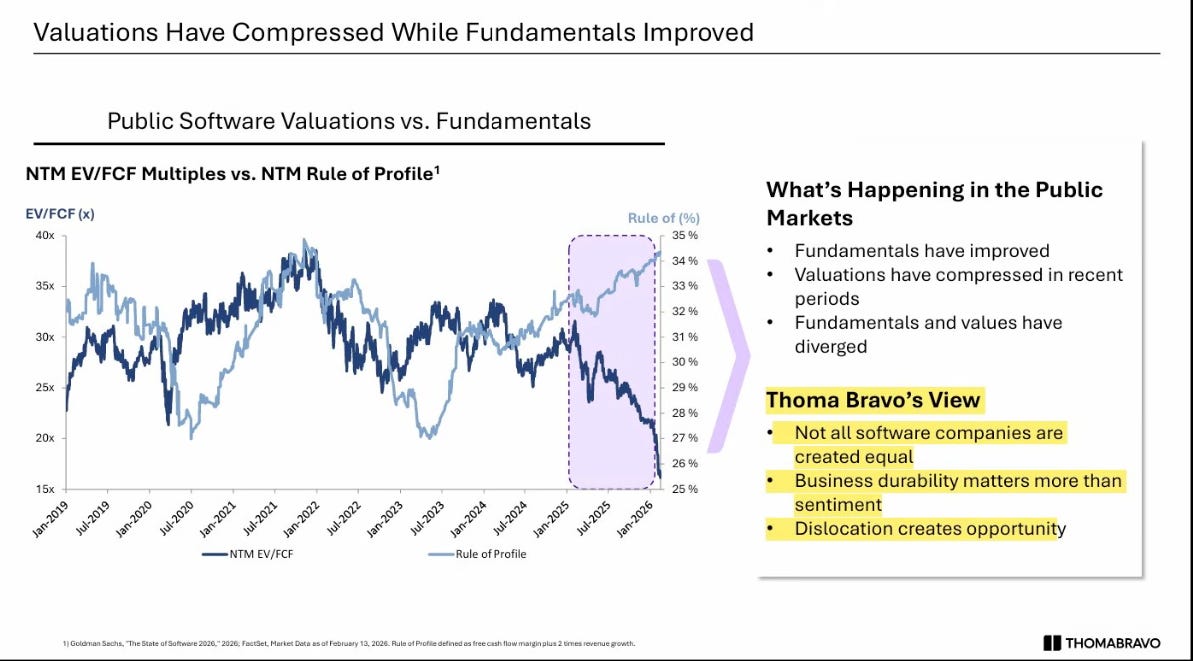 The market is splitting in two. Companies the market believes AI cannot disrupt are getting more expensive. Everything else is getting repriced like it might not exist in five years.