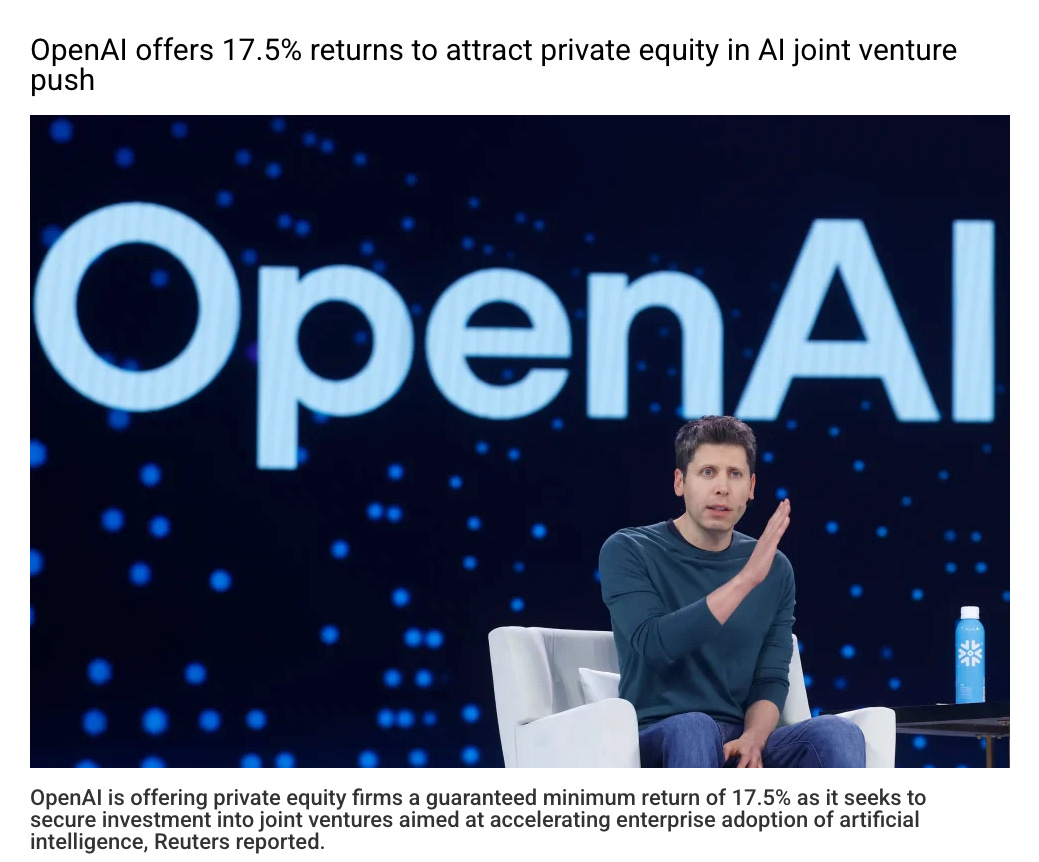 OpenAI just offered private equity firms a guaranteed 17.5% minimum return to help them deploy AI across the companies they own. When the flagship AI company is guaranteeing returns to PE, something fundamental is shifting.