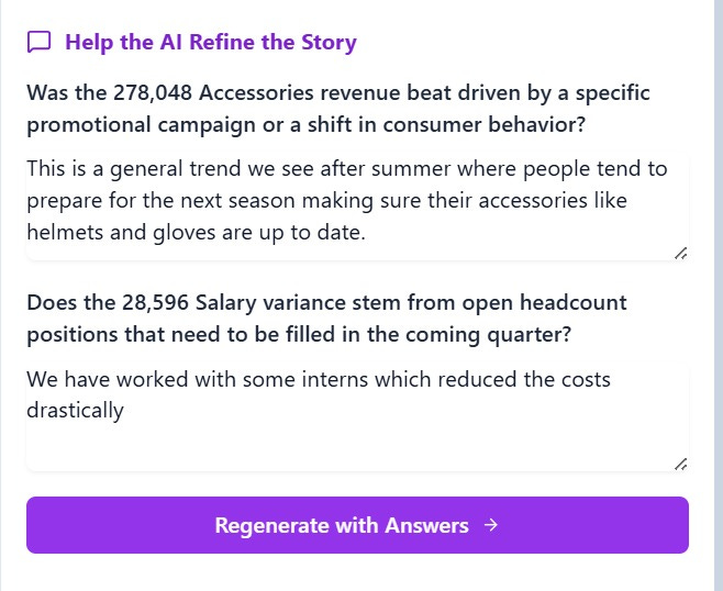 At the bottom of the analysis, AI asks some questions to better understand the variances.